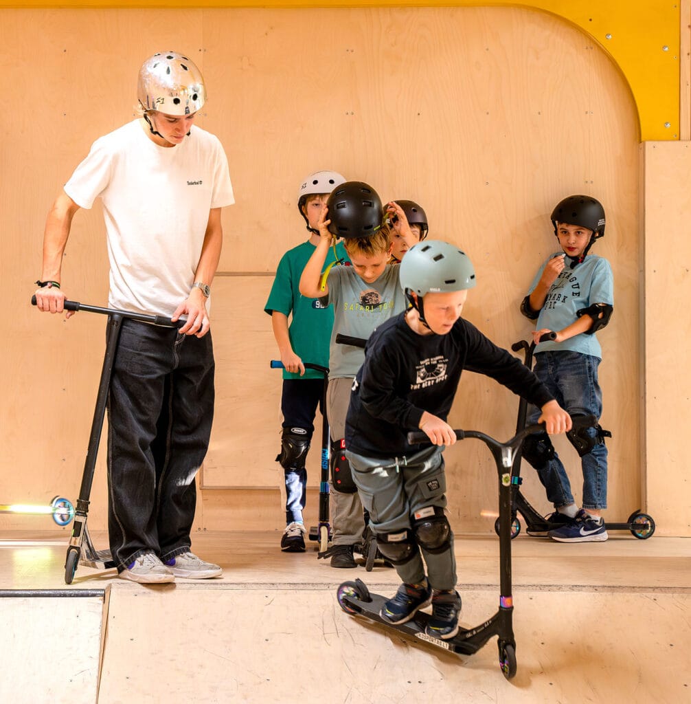 Fun and learning in a group – from first tricks to advanced level. Coaches ensure safety and good vibes for all ages.